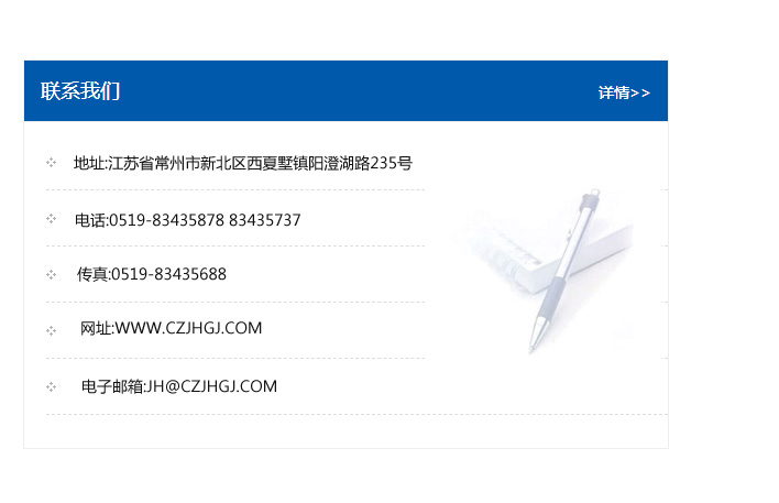 地址:常州市新北區友邦商務大廈1幢16、17層  電話:0519-85101652  傳真:0519-85112595  郵編:213022  網址:www.cz-jiayue_cn.dgxhss.com  郵箱:xiajifengaa@163.com